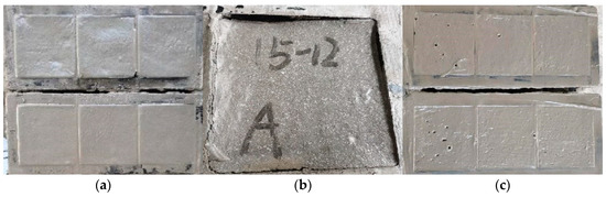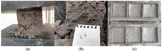 Representative results of compressive strength tests: (a) The shape of the test block damaged by compression; (b) The failure section of the specimen with a water-cement ratio of 0.3; (c) The foams are unstable and break when the blowing agent is diluted 50 times.