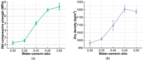 From the results of the multi-factor test, it is clear that the water-cement ratio is the most important factor affecting the compressive strength of foam concrete. In order to optimize the compressive strength to meet the target requirements, further single-factor optimization of the water-cement ratio was carried out. It can be seen that the compressive strength of foam concrete changes sensitively when the water-cement ratio is varied in the range of 0.35 to 0.45 (Figure 8a), and the dry density is changed together with the compressive strength (Figure 8b). The increase in the water-cement ratio can significantly improve the dry density of foam concrete within a certain range, and the dry density reaches the maximum when the water-cement ratio is 0.45. Further increase in the water-cement ratio will make the foam concrete easy to stratify and bleed during mixing and forming, resulting in the increase of the ratio of internal connecting pores and the decrease of dry density of the product. Reducing the water-cement ratio can effectively reduce the compressive strength of foam concrete, but also brings a great loss in dry density. The optimized water-cement ratio is 0.35, which is determined by requirements on the comprehensive strength and density.