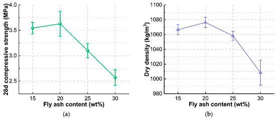 Effect of fly ash content on (a) 28 d compressive strength and (b) dry density of foamed concrete.