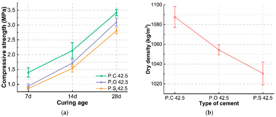 The compressive strength of the foam concrete obtained after water-cement ratio optimization is 2.67 MPa and the dry density is 1028.59 kg/m3, both of which are slightly lower than the target values. The type and usage of cementitious materials are the key factors affecting the performance of foam concrete. Fly ash, as supplementary cementitious material with a smaller particle size than cement, can regulate the particle gradation of cementitious materials and optimize carbon emission at the same time. As seen from Figure 9, it can be seen that the dry density of foam concrete firstly increases and then decreases with the increase of fly ash substitute level, which is consistent with the change of compressive strength. The fly ash can evenly disperse in the slurry and fill into the pores, so that the density increases. When the addition of fly ash exceeds the optimum addition, the ball lubrication effect leads to the increase of the pore size and the connected pores, and a decrease of compactness. Therefore, the dry density is increased to meet the target performance requirements by reducing the fly ash addition to 25%. In addition, cement is the main cementitious material of foam concrete, and the suitable type of cement is not only beneficial to performance improvement but also brings a better economy. The effect of cement type on the performance of foam concrete was studied on the basis of optimized mixing proportion. The density and strength of foam concrete prepared by different types of cement are shown in Figure 10. It shows that foam concrete prepared by P.C 42.5 can obtain higher early strength, which is beneficial to reduce foam rupture and increase the stability of foam concrete, and the 28 d compressive strength and density of the prepared foam concrete are higher than those of concrete made of P.O 42.5 and P.S 42.5 cement. Based on the above analysis, the optimum replacement rate of fly ash is determined to be 25% and the P.C 42.5 cement is selected. Under these conditions, the compressive strength and dry density of the prepared foam concrete are increased to 3.42 MPa and 1087.64 kg/m3, respectively, which are close to the target values. The prepared foam concrete has a low cost.