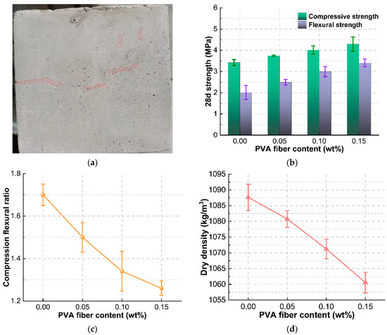 (a) Micro cracks on the surface of foamed concrete specimens; (b) Effect of PVA fiber content on compressive and flexural strength; (c) Effect of PVA fiber content on compression flexural ratio; (d) Effect of PVA fiber content on dry density.