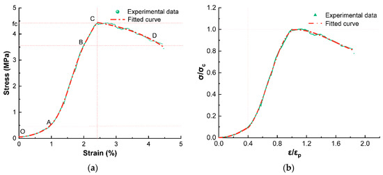 The constitutive relationship of foam concrete under uniaxial compression is the main basis for the selection of each parameter index for finite element simulation, which can fully reflect the basic characteristics of foam concrete such as strength and elastic-plastic deformation [40,41]. Foam concrete is a nonlinear material similar to ordinary concrete [31], and uniaxial compression experiments were conducted on foam concrete by short-term loading, i.e., the load was monotonically increased from zero until the foam concrete specimens were broken. The stress-strain curve of the foam concrete with this ratio was obtained as shown in Figure 12a. In order to better describe the stress-strain variation law at each stage, the stress-strain test results were standardized to obtain a typical stress-strain relationship curve as shown in Figure 12b.