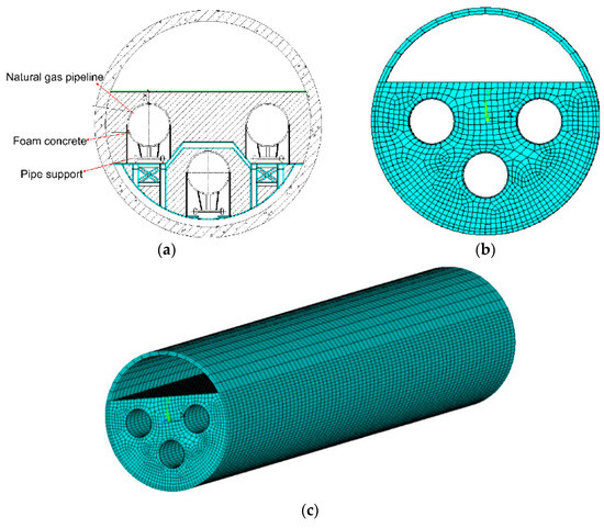 The ANSYS software was used to simulate the working conditions of the foam concrete filler during operation, and foam concrete in a horizontal section of the tunnel was selected for analysis. The shield tunnel lining concrete, natural gas pipe, and foam concrete are all isotropic linear elastic materials, and the material properties are assigned according to the material properties as shown in Table 9. The model parameters of the foam concrete-filled tunnel are shown in Table 10, and the gas pipeline tunnel model is established by combining the shield tunnel section layout (Figure 13a). Different methods were used to mesh the tunnel lining concrete ring, natural gas pipeline, and foam concrete, as shown in Figure 13b,c. The foam concrete filler has a certain self-stability after hardening, which has a certain restraint effect on the gas pipe. There is also certain bond strength between the pipe and the foam concrete. This model is based on the simplified relationship without considering the bond-slip relationship between the axial pipe and foam concrete. The pipe and foam concrete are assumed to contact each other directly, and the liner outside is set as fully restrained. The design operating pressure of the natural gas transmission pipeline is 10 MPa. The ANSYS finite element calculation is thus carried out for the foam concrete filled in the annular space.