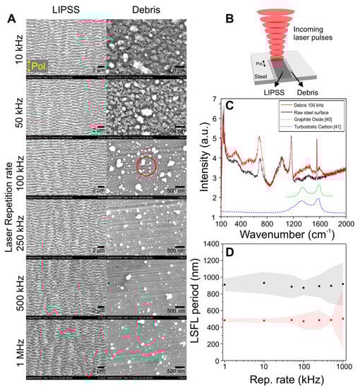 (A) SEM micrographs of LIPSS structures and redeposited debris in steel 1.7131, fabricated using a high laser fluence ϕ = 1.5 J/cm2, and Neff 1D = 40. Beam polarization is indicated by the double yellow arrow; (B) Sketch that indicates the scanning direction and the approximate locations where the images for the LIPSS and debris where taken; (C) Micro Raman characterization of the debris-region fabricated at 100 kHz (red circle in A) compared to the clean unirradiated steel surface and to data for graphite oxide and turbostratic carbon from references [40] and [41], respectively. Reprinted (adapted) with permission from Ref. [40]. Copyright 2008 American Chemical Society. (D) Plot of the LIPSS periods obtained from FFT maps (not shown) of the SEM micrographs. The major period is plotted in black squares, and the minor period in red circles. The shaded areas correspond to error bars calculated as indicated in Materials and Methods section.