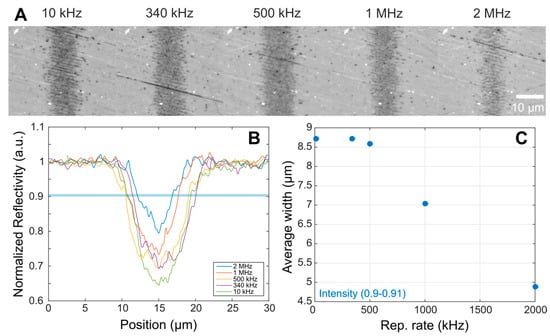 (A) Optical microscopy images of regular ablation lines (Neff 1D = 10) produced at different repetition rates and constant near-threshold fluence ϕ = 225 mJ/cm2; (B) Normalized reflectivity cross-sections of the lines shown in (A); and (C) Plot of the line widths measured within the reflectivity range 0.9 to 0.91 highlighted as a blue shaded line in (B).