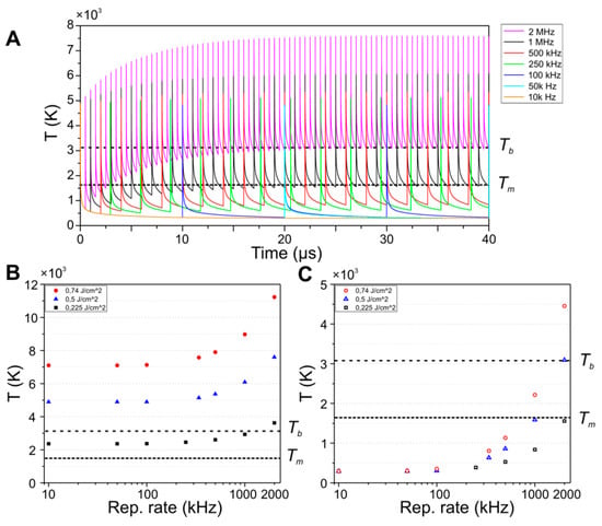 (A) Temperature curves versus time for different repetition rates acquired in dynamic probe mode, showing multiple peaks that correspond to the arrival of a pulse over the moving temperature probe. The experimental parameters are the same of the experiment shown in Figure 5A (ϕ = 0.5 J/cm2, and Neff 1D = 30); (B) peak temperature; and (C) base temperature from simulations for different repetition rates. The dashed lines in correspond to melting and boiling temperatures of steel of 1672 K [45] and ~3300 K [46].