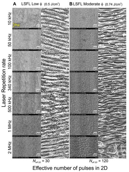 For the case of LSFL at low fluences in Figure 5A, well-pronounced ripple structures are visible. The general structure orientation follows a trend perpendicular to the polarization, however, due to the low fluence and number of pulses used (ϕ = 0.5 J/cm2, Neff 2D = 30), this expected orientation is affected by the natural orientation of the polished surface scratches, resulting in orientations that are slightly off the horizontal expected direction. This effect is more visible in the optical microscopy images of Figure 2, where the natural scratches on the unirradiated sample dominate and define the final orientation of the LSFL. For the areas in Figure 5B irradiated at moderate fluence (ϕ = 0.74 J/cm2) and a higher number of effective pulses (Neff 2D = 120), the influence of the natural scratches is overcome and the LSFL are oriented horizontally with no offset inclination. At this fluence, the LSFL produced in the range of 340 kHz to 2 MHz, present visible deformations corresponding to ripples with slightly larger periods and less debris superimposed. These results agree well with our model in Figure 4 regarding the repetition rate range in which the morphology start to show visible changes in Figure 5B. Additionally, the formation of grooves parallel to the polarization [4,47] with periods around ~3.0 µm that break the continuity of the horizontal ripples are present, more visible for the structures produced at 2 MHz. The presence of grooves, not detected for the LSFL at low fluences, suggest that at this fluence and effective pulse number, the morphology of the LIPSS start to present features produced by thermal effects at high repetition rates.