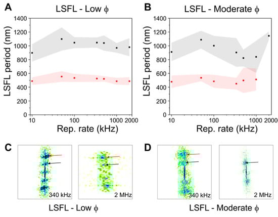 LIPSS periodicity at (A) low and (B) moderate laser fluences (ϕ) for different repetition rates, ranging from 10 kHz to 2 MHz. The LSFL structures contain two sets of periodicities, one plotted as black squares (and gray error bars as shadowed areas) for periodicities close to the laser wavelength (~1 µm) and a second one plotted as red squares (and red error bar regimes as shadowed areas) for smaller periods (~500 nm). The central period values and error bars were calculated from the FFT maps following the procedure described in [24] for each SEM micrograph shown in Figure 5. A selection of FFT maps is included in (C) for LSFL at low fluences at 340 kHz and 2 MHz, and (D) for moderate fluences for the same repetition rates, to visualize the coexistence of two clouds of points, indicative of the presence of two different periods, except for LSFL—moderate fluence at 2 MHz.