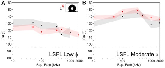 Contact angles (CA) measured from two different viewing positions X (red dots) and Y (black squares) of laser irradiated areas (droplet image included in the inset) for LSFL at (A) low and (B) moderate fluences. The horizontal dotted line corresponds to the CA measured on the un-irradiated sample surface for comparison. The error bars displayed as shadowed areas were determined as indicated in the Materials and Methods section.