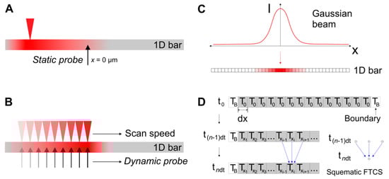 Schematic representation of the used model that implements the 1-D heat flow equation in a 1-D steel bar. Two general modes are employed, (A) a static probe that registers the temperature of individual pulses arriving at different positions from the probe used for simulation results of Figure 3A,B, and (B) a dynamic temperature probe and a scanning laser beam that heats the steel bar and moves from left to right at a given speed, such as in the experiments shown in Figure 3C. The moving temperature probe registers the temperature at intervals dt = 1 ns. (C) The temperature curve distribution used as input for each pulse correspond to a Gaussian beam, translated into the 1D bar individual cells which size is dx = 15 nm. (D) FTCS scheme for the temperature averaging of individual cell calculated every time increment dt = 1 ns.