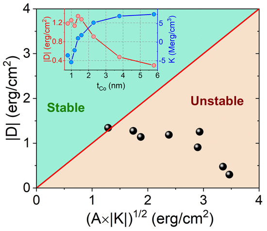 In this section, we recall the measured properties on a series of samples [28] where a specific structure has been identified as a good candidate for hosting skyrmions. The structure of the samples is Pt(1 nm)/Co(t)/MgO(1nm), where t is varied from 0.8 to 5.8 nm. The respective Co thickness dependence of and K are shown in the inset of Figure 1. Each sample is represented by a point in the (, ) diagram shown in Figure 1. We deduce from this experimental study that the appropriate Co thickness is t = 1.4 nm, for which is close to 1, as is the largest and is the smallest. The magnetic parameters for this sample are μerg/cm, emu/cm, erg/cm, and Merg/cm. Thus, these parameters are considered for numerical calculations.