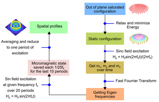 We used the free micromagnetic software MuMax [26] to perform static and dynamic calculations. These calculations rely on the energy per volume unit , where the z axis is perpendicular to the magnetic layer, the x and y axes are in-plane, is the magnetization, is the anisotropy energy (regardless of shape anisotropy), A is the exchange constant, D is the effective DMI constant, is the external field, and is the demagnetizing field. Here, is determined from the Maxwell equations , and the boundary conditions. For the specific material parameters corresponding to the experimental results, we studied the static configuration for different dot diameters in the range of 100–300 nm. The scheme of calculations is described in Figure 2; starting from the out-of-plane saturated configuration, the static configuration is obtained by energy minimization; this configuration is then disturbed and the response is analyzed to obtain the eigenfrequency and the corresponding profile. With the parameters (measured on real samples) and considering the experimental protocol where the sample is initially saturated out-of-plane, only one configuration can be stabilized. Other configurations might exist, as discussed in [29], and this could be an avenue of investigation in future research; however, the aim of the paper is to prepare an experimental study. In this study, the sample is initially saturated out-of-plane, ensuring that the magnetization configuration is known.