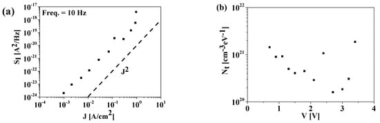 - Giusi, G.; Aoulaiche, M.; Swerts, J.; Popovici, M.; Redolfi, A.; Simoen, E.; Jurczak, M. Impact of Electrode Composition and Processing on the Low-Frequency Noise in SrTiO3 MIM Capacitors. IEEE Electron Device Lett. 2014, 35, 942–944. [Google Scholar] [CrossRef]