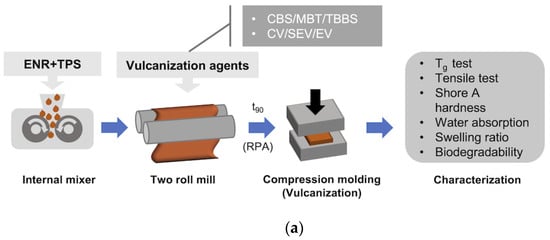 The prepared ENR/TPS mixtures were firstly masticated on a two-rolled mill at room temperature (BAŤA, Zlín, Czechoslovakia) and then the vulcanization agents were added and milled for 20 min. All milled mixtures were molded and vulcanized into a sheet (150 × 150 × 2 mm) by hydraulic press at 150 °C for optimal vulcanization time based on (t90) (Figure 1).