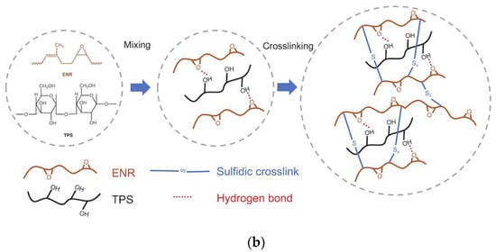 Schematic illustration of (a) the ENR/TPS blends’ preparation and vulcanization workflow; (b) the principle of ENR/TPS sulfidic crosslinking.