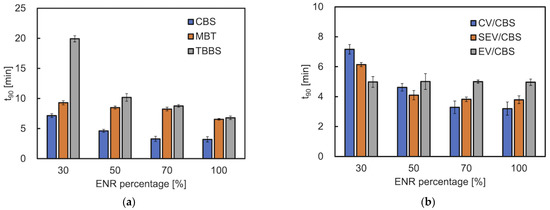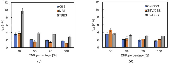 Scorch time (t0.2) is the maximum length of time for which a rubber compound can be worked at a given temperature before curing begins [19] (Figure 3c,d). The t0.2 of mixtures containing TBBS was the longest (values 3.6–9.7 min) compared with the other two accelerators. The ENR content has little effect on the t0.2 of the EV curing system (values 3.1–3.7 min).