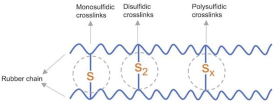 Vulcanization (curing) transforms a thermoplastic rubber compound into a highly elastic product through physical and chemical reactions. The principle of vulcanization is the formation of chemical cross-links between the rubber chains, thus forming a 3D network [5]. Vulcanization can generally be classified according to curing agent into sulfur, peroxide, metal oxide and special systems [6,7,8,9]. Sulfur vulcanization is the most common method in the industry. Sulfur vulcanizates tend to exhibit greater tensile strength than peroxide vulcanizates, as well as better abrasion resistance and tear strength [10]. The main polymers vulcanized by sulfur are natural rubber, styrene–butadiene rubber, polybutadiene rubber or ethylene–propylene–diene rubber [11].