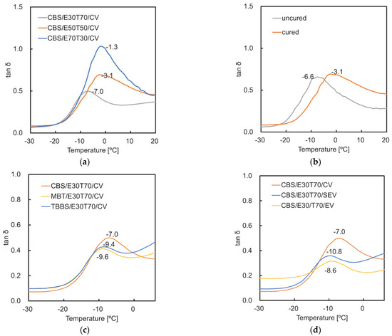 Effect of (a) ENR content (30 wt.%, 50 wt.%, 70 wt.%); (b) curing (CBS/E50T50/CV); (c) vulcanization accelerator types (CBS, MBT, TBBS); (d) sulfur/accelerator ratio (CV/CBS, SEV/CBS, EV/CBS) on the loss tangents as function of temperature.