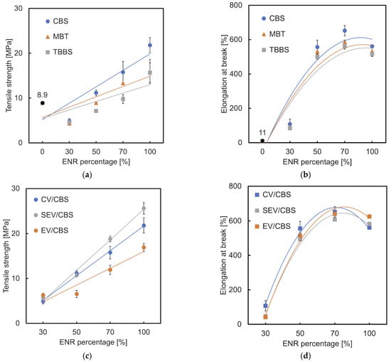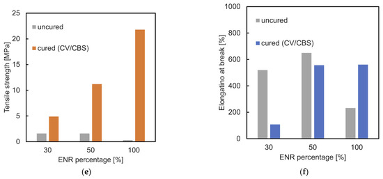 The influence of the cure-type accelerators and vulcanization systems on the tensile properties of the developed materials is shown in Figure 6. Usually, tensile strength increases with crosslink density and elongation at break is inversely proportional to it. This was confirmed by L. González et al. [34]. Comparing the tensile strength of the investigated blends with different curing accelerators (CV system), materials with CBS proved to have the highest value (Figure 6a). This indicates the highest crosslinking of these samples which was confirmed by the swelling ratio in Section 3.6. Unexpectedly, an increasing trend is shown in the elongation at break (Figure 6b). This can be explained by the binding of ENR to TPS which breaks the hydrogen bonds in the starch structure. The higher the ENR content in the mixture, the more hydrogen bonds are broken, which results in the increases in elongation at break. This also explains our previous research [3]. The materials (CBS-CV) which contain 50 wt.% ENR and higher, show a significantly higher tensile strength than TPS alone. All the investigated ENR/TPS blends show much higher values of elongation at break than those of TPS. Regarding the influence of different sulfur/accelerator ratios on the tensile strength, the samples cured by the CBS-SEV systems have the highest values, followed by the CV system. This is because due to the higher concentration of accelerator in the SEV system, a reaction such as either desulphurisation or decomposition may occur. Desulphurisation results in mono and disulfide linkages, whereas decomposition leads to cyclic sulfides and dienes. In accordance with [35], the higher the concentration of mono and disulfide crosslinks, the higher the tensile strength of the SEV compared to that of the CV system containing the higher concentration of polysulfide crosslinks. However, based on our previous experimental results, vulcanizates with polysulfidic crosslinks have higher tensile strength and elongation at break than those with monosulfidic ones. The noticeable improvement of tensile strength can be observed in the comparison of all tested cured (CBS-CV) and uncured samples (Figure 6e). The elongation at break of the cured ENR/TPS (30/70) shows a significantly lower value (110%) than the uncured one (520%). This may be explained by the stronger influence of decrease in crosslink density (Figure 6f). The values of cured (560%) and uncured (650%) samples of E50T50 are very close.