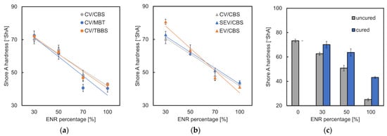 Shore A hardness of ENR/TPS in different ratios and (a) different accelerator types; (b) different cure systems; (c) cured (CBS/CV) and uncured samples.