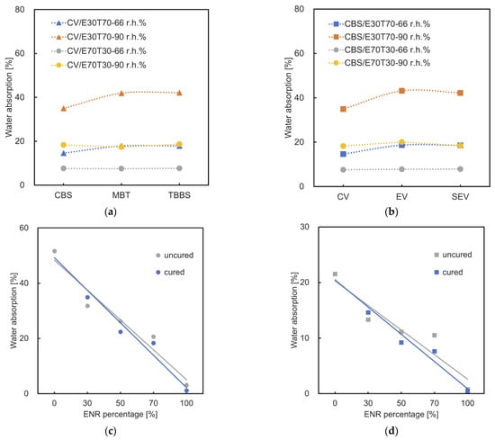 Water absorption was measured for the samples which showed better mechanical properties. It is reasonable that higher levels of ENR% result in a lower water uptake of the mixture, regardless of environmental humidity. Comparing different accelerator types (CV system), the CBS samples show the lowest water absorption (Figure 8a). This proves that the most efficient crosslinking is achieved by using CBS. As the crosslinking density is increased, the water diffusion decreases and the slowdown in diffusion is more severe at the polymer−water interface. The water diffusion at various crosslinking densities correlates with the water–hydrogen bonding dynamics [36]. However, the number of hydrogen bonds/hydrophilic groups open to interaction with water affects this hydrophilicity. The samples vulcanized by the CV system (CBS accelerator) have a lower water absorption than those of the SEV and EV systems (Figure 8b). This is because the CV system contains the highest amount of sulfur, which was pointed out by Ismail, H., Salmah and M. Nasir [37]. Furthermore, a higher concentration of crosslinks in the CV system, which was proved by means of the swelling ratio, as seen in Section 3.6, confirms the low water absorption. It can be observed that the cured sample CBS/E30T70/CV shows higher water absorption than the uncured blend (Figure 8c,d). When ENR% ≥ 50%, the water absorption of cured materials is lower than the uncured samples. This is consistent with the results of the tensile test and can be explained as there are more hydrogen bonds broken than effective crosslinks created in the low ENR% mixture. The breaking of hydrogen bonds results in higher hydrophilicity [38,39].