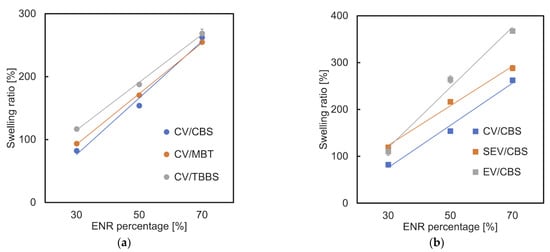 Swelling ratio of ENR/TPS in different amount ratios and (a) different accelerator types (CV system); (b) different cure systems (CBS).