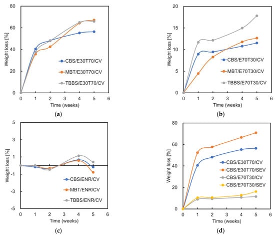 The weight loss observed among the vulcanized ENR/TPS blends during the degradation process is depicted in Figure 10. The weight loss that had been recorded ascertains that the degradation process did take place in the samples due to the presence of moisture and microorganisms in the soil. The weight loss further caused some changes to the surface morphology of the samples. In Figure 10d, the mass loss percentage of the cured E30T70 samples is significantly higher than for the cured E70T30 samples, which confirmed that the main biodegraded part is TPS. The samples cured by the SEV system show a higher mass loss percentage than those of the CV system, which indicates better biodegradability. This proves that better biodegradability also corresponds to lower crosslinking efficiency in the SEV system than in the CV system, which was described in the swelling ratio section. During the first two weeks, the MBT samples exhibited a lower weight loss (degradation rate) compared to other two. This is due to the higher ENR swelling in the soil moisture (Figure 10c). The swelling behavior can be found in the previous research as well [3]. Furthermore, the water absorption of the MBT-CV samples shows a higher value than that of the CBS-CV samples (Figure 8a). The significant weight loss of pure cured ENR after 4 weeks (Figure 10c) can be explained by the loss of fragments and small particles from the surface. The TBBS/E70T30/CV shows the highest mass loss (biodegradation rate) due to the poor crosslinking efficiency (Figure 10b). Low-chain network density accelerates the decomposition. After 4 weeks, the samples showed a lower biodegradation rate, except for TBBS/E70T30/CV. At the 5th week, the mass loss of CBS/E30T70/CV was 56.4%, which is less than that of the SEV system sample (70.8%). The same trend for the CBS/E70T30 is observed: 11.5% for the CV sample and 16.2% for the SEV sample. This further indicates that the CBS samples exhibit the lowest mass loss compared to the other two due to the higher crosslinking degree.