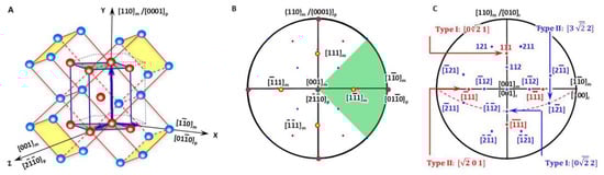 For an isothermal precipitation, the non-inclined vector in the direct space is the shortest Burgers vector in the matrix. The shortest Burgers vector in the BCC matrix is b = <111>m/2 and has four variants; see the four yellow solid circles in Figure 2B. Its form in the reference coordination system b′ is obtained by