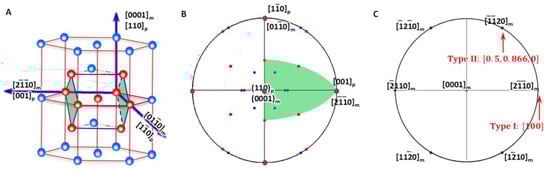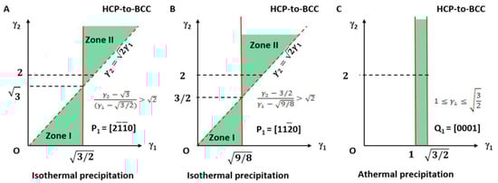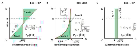 Figure 8A shows the athermal precipitation of a BCC-to-HCP transformation with LPR γ2 = 1 and γ1 varying in a full range of (1 to 1.2247). Figure 8B shows that for an HCP-to-BCC transformation. It is found that they share the same LPR range, and the crystallographic features are mutually exchangeable by considering lattice conversion between BCC and HCP. The equivalence of phase transformation direction seems true for athermal precipitation. However, this is not true for isothermal precipitation. This can be confirmed by comparing the calculated results in Figure 6A and Figure 7A, both of which are controlled by a non-inclined vector parallel to the matrix’s Burgers vector. Apparently, the LPR range of BCC-to-HCP isothermal precipitation is different from that of HCC-to-HCP. The non-equivalence of phase transformation direction was also verified in the FCC–BCC system [25]. The equivalence of phase transformation direction becomes true as long as both cases are sharing the same rotation axis in the reference coordination system.