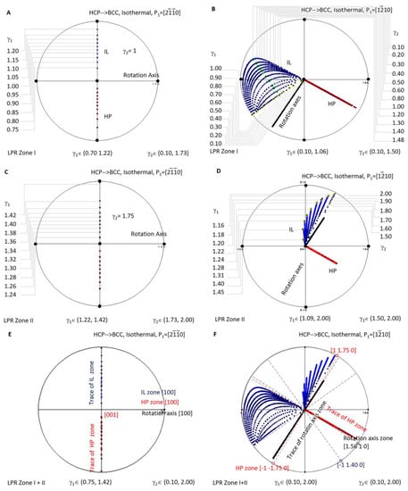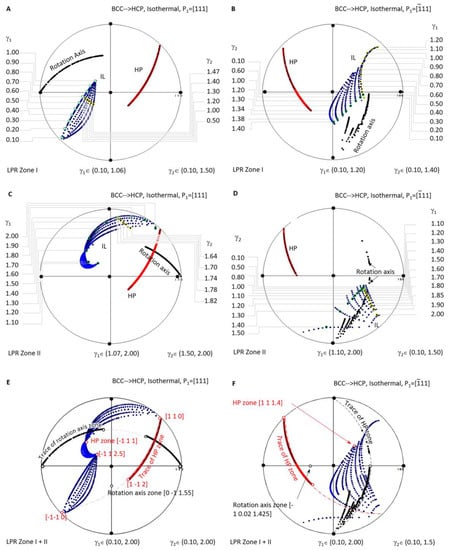 A similar investigation was carried out for isothermal precipitation in HCP-to-BCC transformation. Figure 7A is a stereographic projection showing calculated HP and IL for isothermal precipitation controlled by a non-inclined vector parallel to in LPR Zone I where γ2 belongs to (0.10, 1.73) and γ1 to (0.70, 1.22), and in Zone II where γ2 belongs to (1.73, 2.00) and γ1 to (1.22, 1.42). Figure 7C is a stereographic projection showing calculated HP and IL for isothermal precipitation controlled by a non-inclined vector parallel to in LPR Zone I where γ2 belongs to (0.10, 1.50) and γ1 to (0.10, 1.06), and in Zone II where γ2 belongs to (1.50, 2.00) and γ1 to (1.09, 2.00). The Burgers vector and slip plane normal of the HCP structure are parallel to one of the three basal axes of the reference coordination system, so it is a one-step rotation axis. Consequently, the generated HP normal and IL locate at the same plane when the lattice parameter ratio γ2 varies. If HP and IL points are all plotted for each of γ2, they will occupy the whole trace of the plane and become not distinguishable. For the sake of easy reading, the dataset is plotted for only one value of γ2, i.e., γ2 = 1 in Figure 7A and γ2 = 1.75 in Figure 7C. Figure 7B,D correspond to the case of P1//.