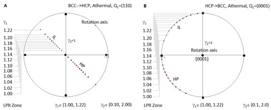 Figure 8A shows the case for BCC-to-HCP athermal precipitation where LPR γ2 has no limitation. Since all the IL spots fall in the same location when LPR γ2 changes, an arbitrary value between 0.1 and 2 is selected to show the distribution of IL and HP for different LPR γ1. HCP-to-BCC athermal precipitation is plotted in Figure 8B.