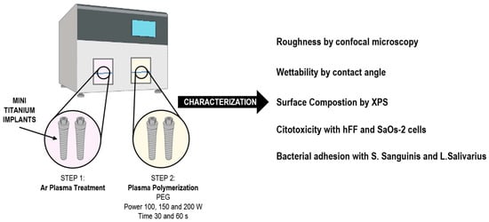 In Figure 4, we can see a scheme of the research carried out with the titanium mini-implants, the preparation of the samples coated with PEG plasma polymerization and the characterization carried out.