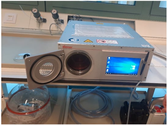 The methodology of plasma activation process for Ti surfaces was carried out as explained by Buxadera et al. [10]. These samples (n = 30) were treated by radio frequency low-pressure plasma apparatus (Plasma System Femto, Diener, Germany) using 13.52 Hz for 10 min treatment, with argon at a pressure of 0.40 mbar (Figure 5). This treatment was realized to activate the titanium surface and, for this reason, was carried out by argon nonpolymerizing gas. Plasma polymerization was performed right after plasma activation in the same reactor without breaking the vacuum. The polymerization precursor was tetra (ethylene glycol) dimethyl ether (tetraglyme, Sigma Aldrich, Sant Louis, MO, USA) introduced by bubbling argon in the reactor, and the parameters used were 100 W, 0.40 mbar and 1 h, according to a previous work [21]. The process was performed in pulsed mode with ton = 20 µs and toff = 20 ms. In Table 1, the different conditions of the plasma polymerization can be observed. Five samples were used for each treatment (power peak and time).