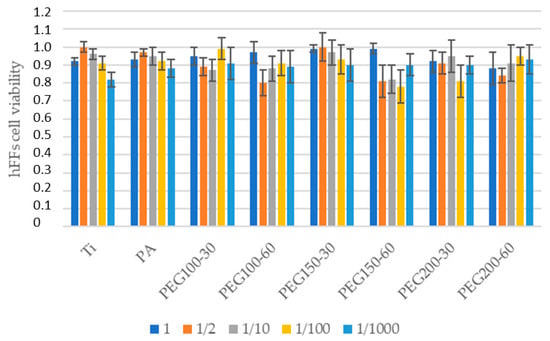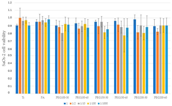 Cell adhesion assays with hFFs (Figure 8) showed no difference between Ti, PA and PEG samples, whereas, for SAOS-2 (Figure 9), a slightly decrease was measured when the samples were polymerized.
