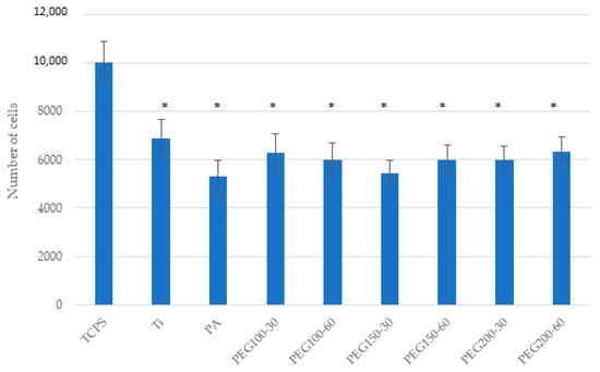 Cell adhesion of SaOS-2 on the Ti, PA and PEG samples. Bars indicated with the same symbol have no statistically significant difference between them (p < 0.05).