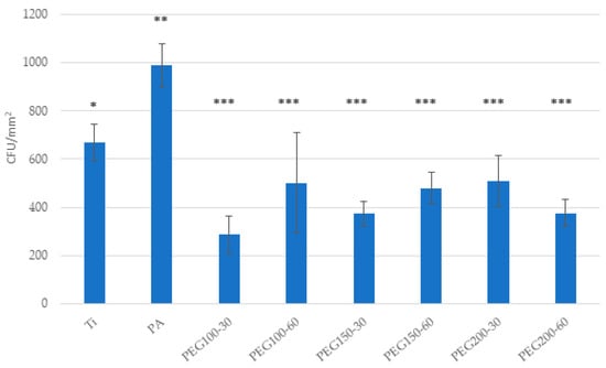 Bacterial adhesion tests showed a decreased bacterial adhesion for all PEG samples, either for the Spectrococcus sanguinis and the Lactobacillus salivarius (Figure 10 and Figure 11, respectively). Ti samples and plasma-activated samples (PA) were used as controls. An increased bacterial adhesion was observed for the PA sample compared to Ti.
