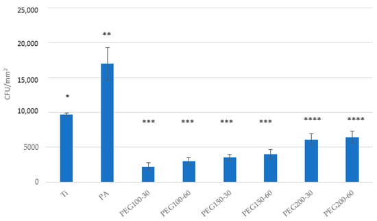 Bacterial adhesion on Ti, PA and PEG samples of Spectrococcus sanguinis. Asterisks indicated with the same symbol have no statistically significant difference between them (p > 0.05).