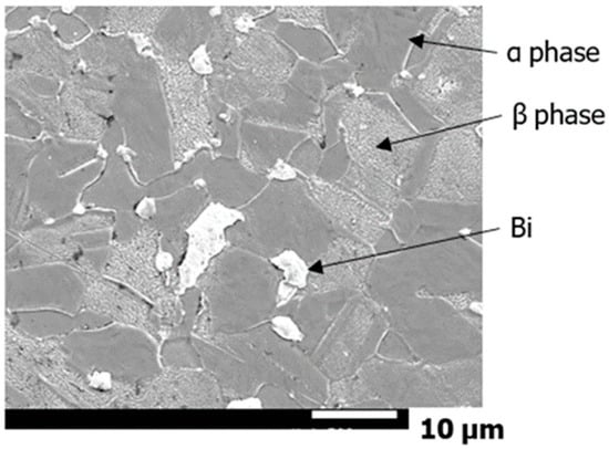 For the component analysis of the α, β, Bi and Pb phases, an energy dispersive X-ray spectroscopy (EDX) that is installed in a scanning electron microscope (SEM) manufactured by JEOL Ltd. (JSM-7001F) was used because the phase size was only few tens of μm. The accelerating voltage was set at 15 keV. Figure 2 shows the SEM photograph of the Bi,A materials, wherein the α, β, and Bi phases are indicated by arrows. Twenty measurement points were randomly selected for each phase, and point analysis was performed using EDX. Additionally, SEM was used to measure the microstructure dimensions by adopting a straight-line cutting method.