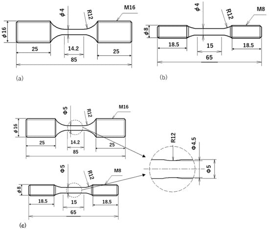Figure 4 shows the shapes and dimensions of the specimens used in this experiment to study the relationship between stress σmax and fatigue life Nf (S-N curve). The specimen shown in Figure 4a was used for the Bi,A and Pb materials, and the specimen shown in Figure 4b was used for the Bi,B material. Since the Bi,B material had a higher degree of drawing than that of the Bi,A material, the specimen grip diameter of the former was narrower than that of the latter. However, the diameter (4 mm) and length (14–15 mm) of the parallel portions of both specimens were the same. In preliminary experiments, it was confirmed that there was no difference in the fatigue life owing to the difference in the shape of the specimen.