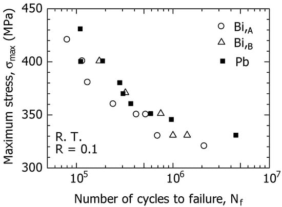 The S−N curves for Bi,A, Bi,B, and Pb materials were calculated by numerically integrating Equation (11). Simpson’s rule was used for the numerical integration. In Figure 13, the calculation and experimental results were compared. The curves (solid lines) in the figures show the calculated results. The calculated results and the experimental data are correlated.