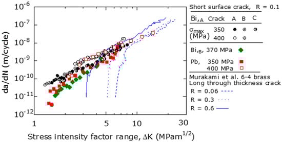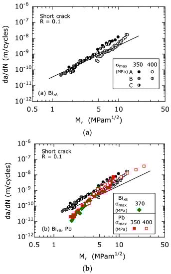 Furthermore, in the low ΔK region of the Bi,A and Pb materials, da/dN at σmax = 400 MPa was larger than that at 350 MPa at a constant ΔK value. This stress dependence on the da/dN − ΔK relationship indicated that it was difficult to apply linear elastic fracture mechanics to the FCG behavior of short surface cracks [5,27].