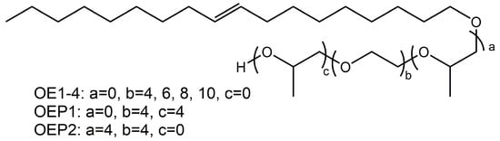 Infrared spectra (FT-IR) were obtained with a Nicolet Impact 410 FT-IR Spectrometer (Thermo Fisher Scientific, Waltham, MA, USA). The FT-IR spectra were scanned over the wave number range of 500–4000 cm−1 using KBr as the carrier. Nuclear magnetic resonance spectra (1H-NMR) were obtained with a Bruker AVANCE 400 Fourier transform NMR spectrometer (400 MHz, Bruker, Billerica, MA, USA) using CDCl3 as the solvent. Elemental analysis results were carried out on a LECO 932 CHNS elemental analyzer (LECO, St. Joseph, MI, USA). The results were as follows: OE1, calculated for C26H52O5 (%), C 70.22 and H 11.79, and found to be C 70.87 and H 11.31; OE2, calculated for C30H60O7 (%), C 67.63 and H 11.35, and found to be C 67.14 and H 10.95; OE3, calculated for C34H68O9 (%), C 65.77 and H 11.04, and found to be C 66.03 and H 10.82; OE4, calculated for C38H76O11 (%), C 64.37 and H 10.80, and found to be C 64.24 and H 11.29; OEP1, calculated for C38H76O9 (%), C 67.42 and H 11.32, and found to be C 67.73 and H 11.82; and OEP2, calculated for C38H76O9 (%), C 67.42 and H 11.32, found to be, C 67.91 and H 11.95.