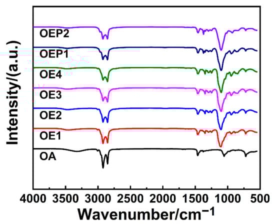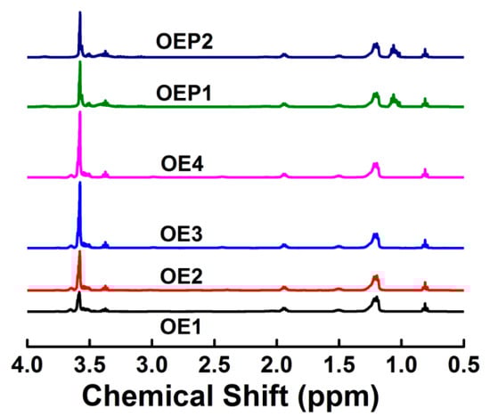 Figure 3 shows the 1H-NMR spectra of the defoamers. For all the defoamers, the peaks at δ = 0.8 are the proton peaks of -CH3 of OA, and the peaks at δ = 1.2 are the proton peaks of -CH2CH2- of OA. For OE1–4, the peaks at δ = 3.5–4.0 are the proton peaks of -CH2-O- of EO, and the integral areas of the peaks of the polyether chains increased with the increase in the amounts of EO. For OEP1 and OEP2, the peaks at δ = 1.05 are the proton peaks of -CH3 of PO, and the peaks at δ = 3.5–4.0 are the proton peaks of -CH2-O- of EO and PO. The results clearly indicate that the EO and PO units were linked to OA successfully, and defoamers of a correct chemical structure were obtained.