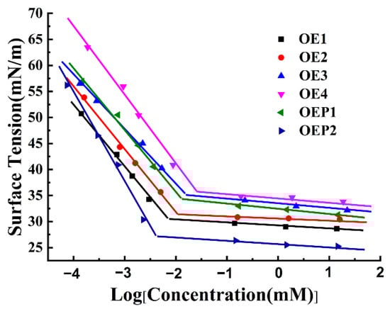 The surface activity of the polyether defoamers was tested firstly. Solutions containing different defoamers of various concentrations were prepared, and the surface tensions of all the samples were tested. Figure 4 shows that the surface tensions of all the samples decreased gradually with an increasing logarithm of the defoamer concentrations. When the concentration of each sample reached its critical micelle concentration (CMC), the surface tension of each defoamer also reached its minimum value (γCMC). The further increase in the concentration of each defoamer induced only a little decrease in the surface tension. Compared with pure water, with a surface tension of 72 mN/m, the surface tensions of the solutions of all the defoamers reached lower values at lower concentrations. The surface tensions of the samples increased with an increased amount of EO units (decreasing hydrophobicity) [,,]. Table 2 shows the CMC and γCMC values of the defoamers, which were calculated by plotting surface tension against logarithmic concentration, as in the previous report [,,,,]. It was observed that both the CMC and γCMC values increased with the increase in the amount of EO unit, and the defoamer linked with PO before EO (OEP2) gave the lowest CMC and γCMC values.