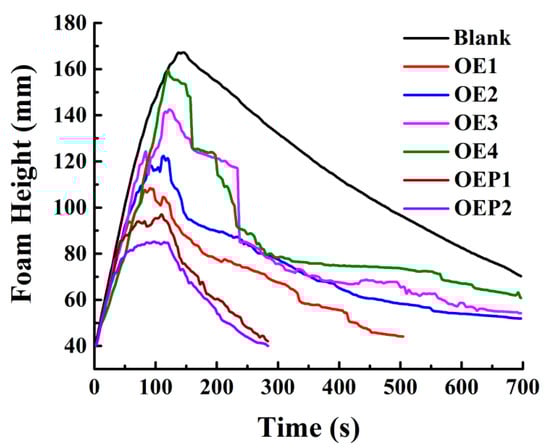 The defoaming performance of the defoamers in aqueous solutions was investigated next. Solutions of polycarboxylate superplasticizer mixed with various defoamers were prepared. Each solution was foamed for 2 min with a gas flow rate of 0.3 L/min, and the real-time changes in the foam height were recorded. Since the solution of polycarboxylate superplasticizer contains a large number of unreacted polyether comonomers, which are hydrophilic and can produce excessive air bubbles in solution, adding the defoamers to the solution can eliminate these bubbles effectively. Figure 5 shows that the foam heights of all the samples increased gradually with the foaming time, and then decreased with the incubation time. The maximum foam heights decreased with the decrease in the amount of EO units, indicating that the defoamer containing less EO (higher hydrophobicity) had a higher defoaming ability in aqueous solutions [,]. It was also observed that compared with the defoamers linked with EO only, the defoamers linked with both EO and PO caused the foam heights to decay more quickly during the incubation time, and the defoamer linked with PO before EO (OPE2) caused the foam height to decay the most quickly. The results indicated that the defoamer linked with both EO and PO had a stronger defoaming capacity, since PO is more hydrophobic than EO, which exhibits weak hydrophilicity. Compared with OEP1 (OA-4EO-4PO, hydrophobic–hydrophilic–weakly hydrophilic), the structure of OEP2 (OA-4PO-4EO, hydrophobic–weakly hydrophilic–hydrophilic) is closer to that of an amphiphilic surfactant; thus, OEP2 exhibits a stronger defoaming capacity.