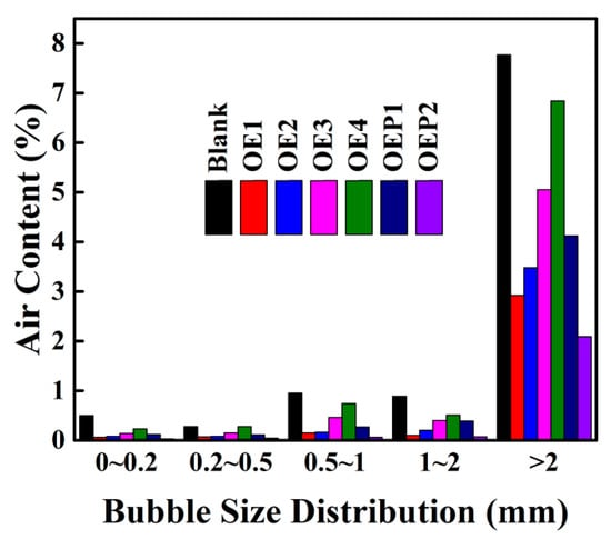 The defoamers in this study exhibited both a high surface activity and defoaming capacity in aqueous solutions. We envisioned that they may also have had a good defoaming capacity in cement-based materials. The defoaming properties of the defoamers in fresh cement mortars were thus investigated. Table 4 shows that compared with the blank sample, the air content of all the samples mixed with the defoamers markedly decreased, and the air content decreased with the decrease in the amount of EO. It can be observed that the defoamers linked with PO before EO (OEP2) gave lower air content (higher bulk density) compared with those linked with EO only. The defoaming properties of the defoamers in fresh cement mortars are highly consistent with those obtained in aqueous solutions. The results tested in fresh cement mortars are also consistent with the results of surface tension, and the defoamer having a lower surface tension value exhibits a higher defoaming capacity. The bubble size distribution of the fresh mortars mixed with various defoamers was also tested. Figure 7 shows that all the defoamers could decrease the air content of the fresh mortars at all the bubble size ranges, and the air contents of the air bubbles at the large sizes (>1 mm) caused a much larger decrease. Since large air bubbles may weaken the mechanical performance of hardened concretes much more strongly [], the defoamers in this study preferred to inhibit and eliminate the harmful large bubbles in the fresh concretes, which may be advantageous to enhance the mechanical performance of hardened concretes.
