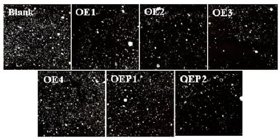 Table 3 shows the maximum foam heights and complete defoaming times of all the solution samples. The results indicate that both the maximum foam heights and complete defoaming times decreased with the decrease in the amount of EO units. The defoamers linked with both EO and PO gave the maximum values of the foam heights and lower complete defoaming times, compared with the defoamers linked with EO only, and the defoamer linked with PO before EO (OEP2) gave the lowest values. The results clearly indicated that the defoamer containing less EO had a higher defoaming capacity, and the defoamer linked with PO before EO had the strongest defoaming capacity. Figure 6 shows the photographs of the bubbles of the samples mixed with various defoamers at the total time of 700 s. It was observed that the defoamer containing less EO induced less and a larger size of bubbles at the time of 700 s, and the defoamer linked with PO before EO (OEP2) induced nearly no bubbles. The results further support the conclusions more directly, which suggest that during the incubation time, the defoamers caused more tiny bubbles to burst then merged into large bubbles.