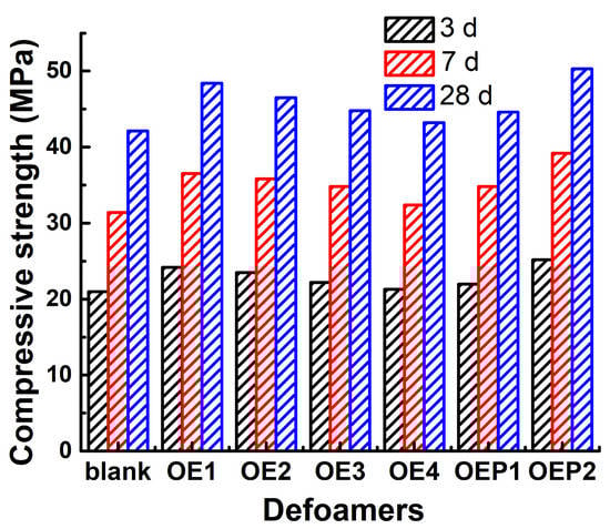 Unlike the small bubbles (<200 μm) produced by air-entraining agents (good for workability and freeze–thaw durability), the use of polycarboxylate superplasticizer has a tendency to produce an excessive amount of large bubbles in fresh concrete. Both the amount and quality of these entrapped bubbles are not controlled, which may decrease the mechanical performance of hardened concrete [,]. Inhibiting and eliminating the excessive harmful bubbles in fresh concretes has been reported to be advantageous in enhancing the mechanical performance of hardened concretes [,,,,]. Table 5 and Figure 9 also show the compressive strengths of the hardened mortar samples mixed with various defoamers after incubation for 28 days. It can be clearly observed that compared with the blank sample, the compressive strengths of all the samples mixed with the defoamers were enhanced, and the defoamers with a higher defoaming capacity caused a larger enhancement of the compressive strength. The results suggest that using polyether-type defoamers in this study was highly beneficial in enhancing the compressive strength of hardened concretes.