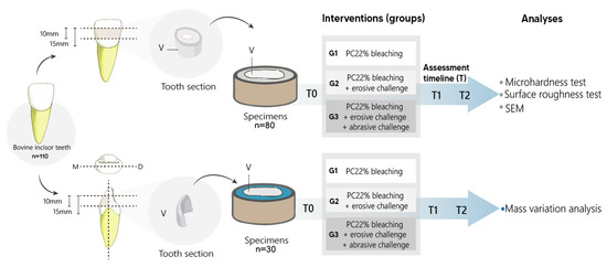 Dental crowns were sectioned in two places using a double-sided diamond disc. The first and second cuts were placed at a distance of 15 mm and 5 mm, respectively, from the cemento-enamel junction; thus, samples were obtained from the middle portion of the dental crown with a height of 10 mm. The specimens used for the MH and SR tests were embedded in a PVC matrix with self-curing resin, and after 24 h, the buccal surface was flattened using a polisher with cooling to standardize the surface of the dental enamel. In the samples used for the analysis of mass measurement and ultrastructure, all of the remaining dentin was removed, leaving only a thin layer of enamel. Finally, the samples were washed with distilled water in an ultrasonic bath for 2 min. The methodological steps of this study are illustrated in Figure 1.
