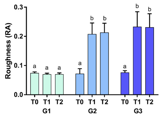 In the excessive bleaching + erosive challenge group (G2) and excessive bleaching + erosive challenge + abrasive challenge group (G3), the SR increased at T1 and T2 compared to that at T0, (p < 0.05), with the highest mean values in G3. In the excessive bleaching group (G1), values at T0, T1, and T2 were similar. Figure 2 shows the average SR.